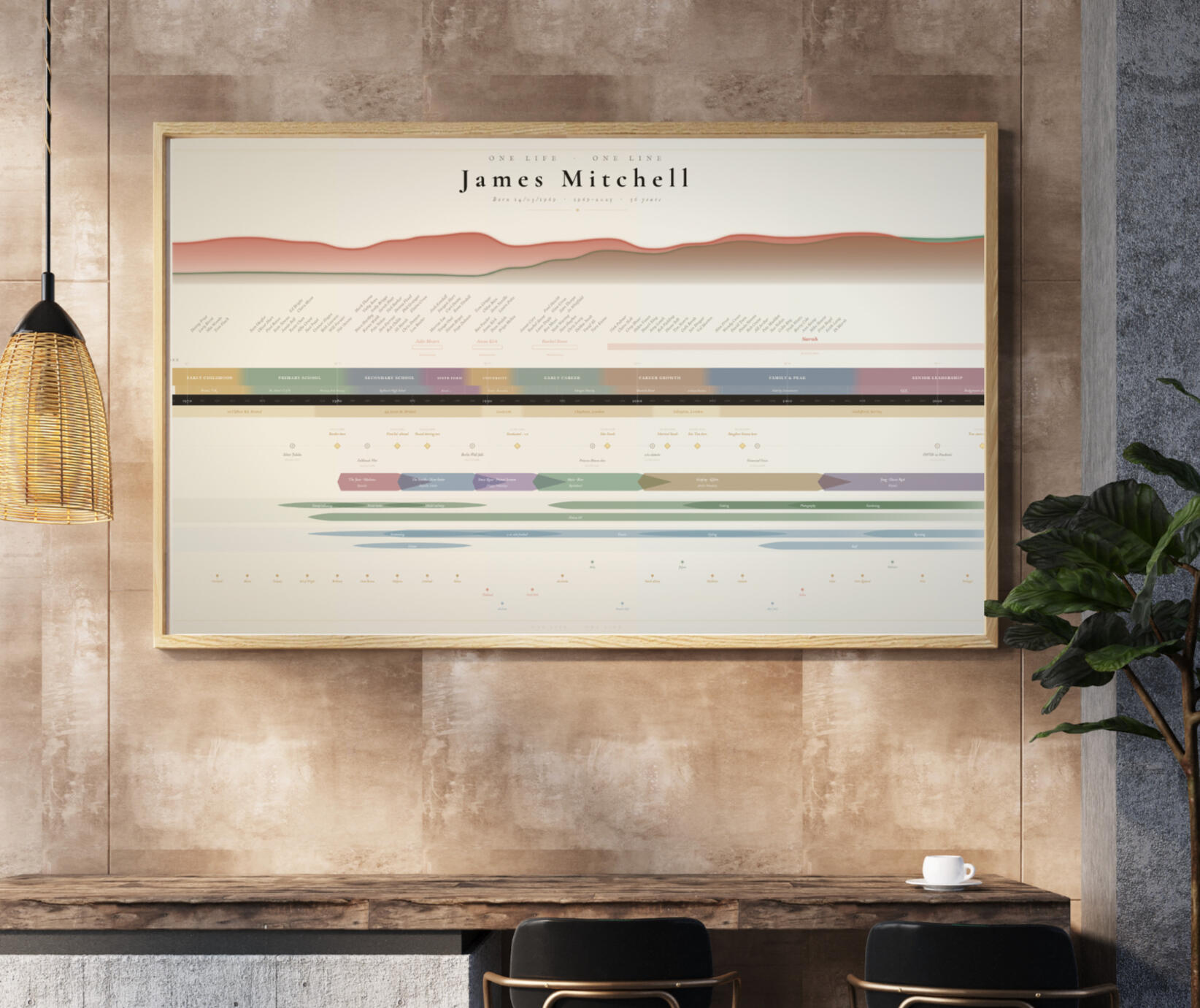 One Life One Line is a guided experience that transforms the story of a life into a single, richly layered artwork - beautiful enough to frame, meaningful enough to keep forever.You work through a simple, unhurried data input form that captures all the elements of the person's life - homes, schools, jobs, people, passions, pastimes, travel and landmark events - everything that made their life what it was.As you build it, an interactive timeline grows in real time - a living, scrollable portrait of a life viewable on any device, that you can explore and share before a single thing is printed.You choose world events to weave in alongside the personal story, so you can see at a glance where a life was, and what it was doing, when history happened around it.When it's complete, you order a fine art print, beautifully framed and ready to hang on any wall, where it will quietly tell its story for decades to come.