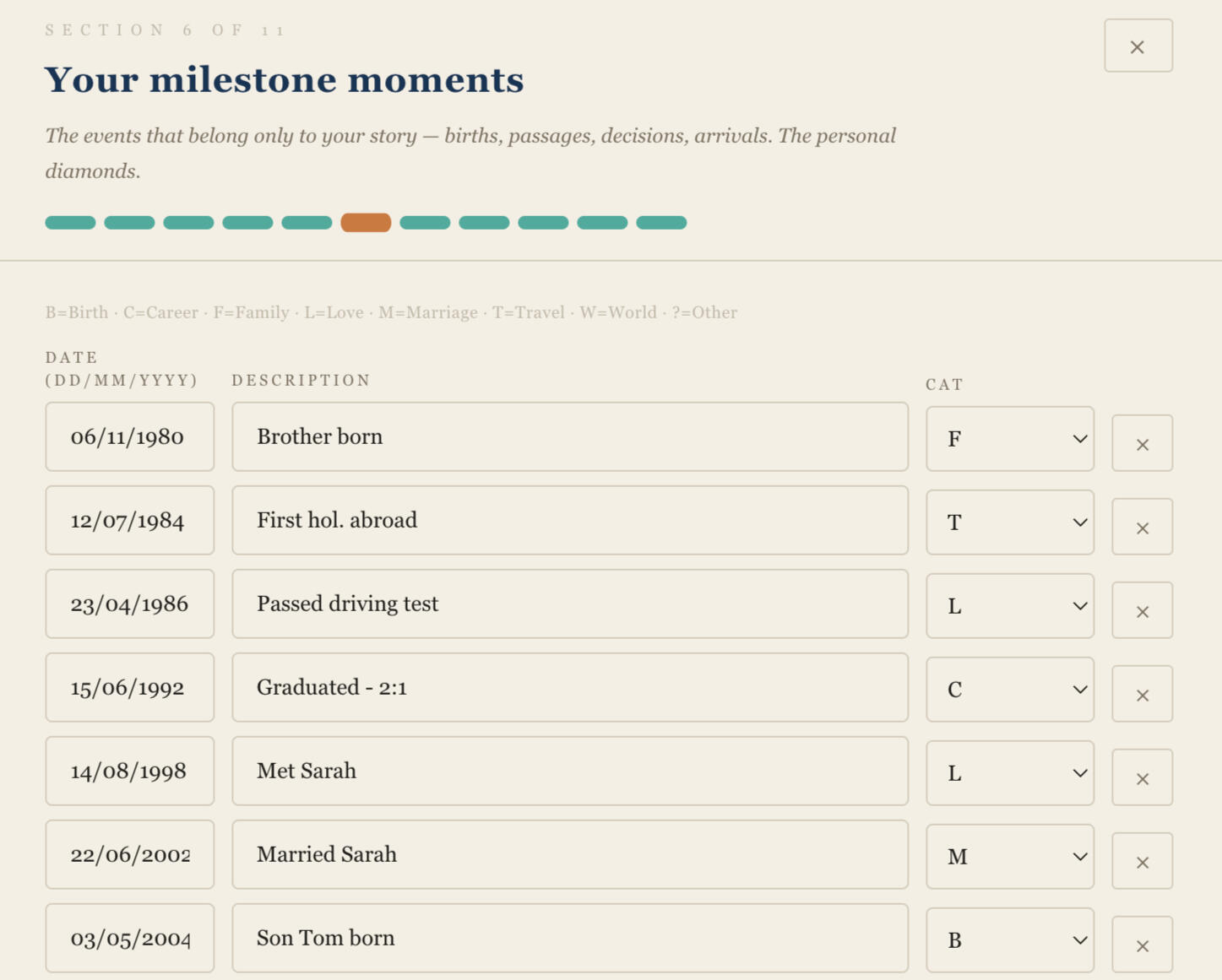 One Life One Line is a working prototype - the interactive timeline is built, the guided process works, and the vision is clear. But there is still design and development work to do before it's ready for the world.The next step is to put it in front of real people. To find out what resonates, what needs refining, and what I may have missed. That's where you come in.