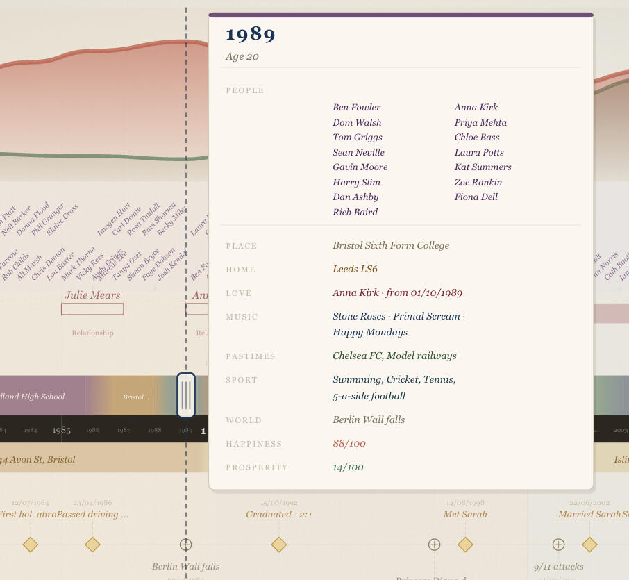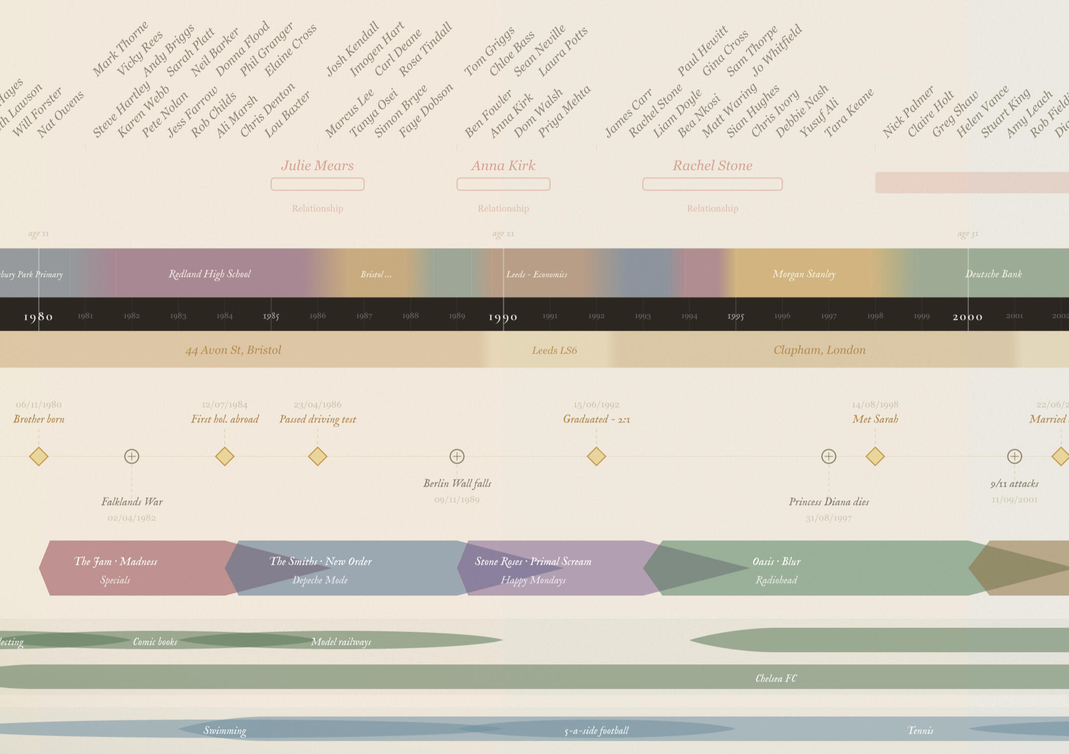 I built One Life One Line for two simple reasons: Firstly, I didn't feel I could remember elements of my own life clearly enough.Everything from the last twenty years is there - I can scroll through it on my phone in minutes. But before that? So much of it is hazy. The places, the people, the things that shaped me - there but indistinct, like a photograph left too long in the light.Secondly, I lost my father in 2015. He lived a full, rich life for eighty years - yet we have nothing to easily glance at that reminds us of the richness and scope of his amazing life. No record of his chapters, his people, his passions. Just memories that fade a little more every year.I don't want that for my own children. So I built this.Jon Bockelmann-Evans, founder