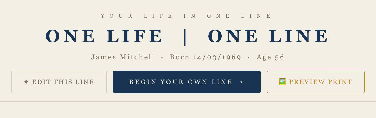 One Life One Line is a guided experience that transforms the story of a life into a single, richly layered artwork - beautiful enough to frame, meaningful enough to keep forever.You work through a simple, unhurried data input form that captures all the elements of the person's life - homes, schools, jobs, people, passions, pastimes, travel and landmark events - everything that made their life what it was.As you build it, an interactive timeline grows in real time - a living, scrollable portrait of a life viewable on any device, that you can explore and share before a single thing is printed.You choose world events to weave in alongside the personal story, so you can see at a glance where a life was, and what it was doing, when history happened around it.When it's complete, you order a fine art print, beautifully framed and ready to hang on any wall, where it will quietly tell its story for decades to come.